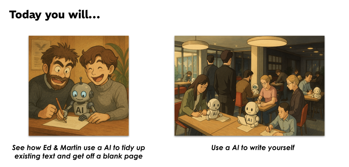 The course - which we called ‘BotCamp’ - was a four-part series covering different roles that AI can play (Scribe, Thinker, Scholar and Designer). Practical applications ranged from quick wins like using AI to rewrite dense quantitative findings for different audiences, to more advanced uses like "vibe coding" prototypes apps (such as an AI car dealer chatbot to practise negotiation skills). Importantly, it was hands-on and light hearted complete with AI-images of staff sprinkled throughout (see below).