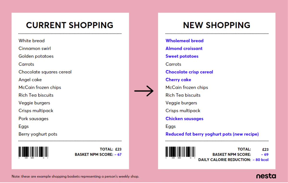In supermarkets, this might look like putting healthier products on promotion, reformulating own-brand items to reduce fat content, or giving more shelf space to low-sugar options. The resulting changes on a shopping basket would be small, as illustrated below: