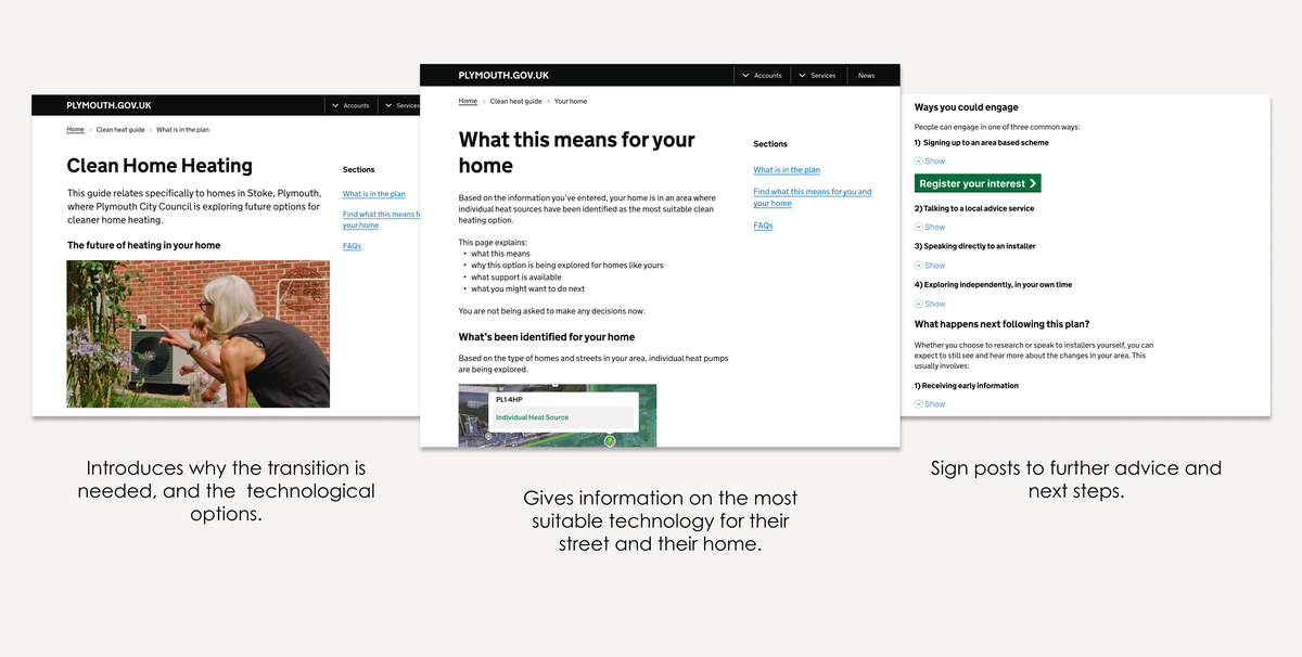Three screenshots from an online guide prototype showing the key steps for communicating with households on clean home heating: introducing the transition, providing personalised technology information, and signposting further advice and next steps
