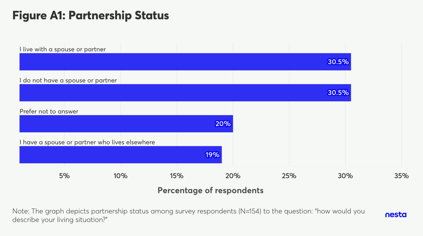 A horizontal bar chart titled 'Figure A1: Partnership Status'. The vertical axis lists four partnership status categories, and the horizontal axis measures the 'Percentage of respondents' up to 35%. The blue bars show the following distribution from top to bottom: 'I live with a spouse or partner' at 30.5%; 'I do not have a spouse or partner' at 30.5%; 'Prefer not to answer' at 20%; and 'I have a spouse or partner who lives elsewhere' at 19%. A footnote at the bottom reads 'Note: The graph depicts partnership status among survey respondents (N=154) to the question: "how would you describe your living situation?"'.