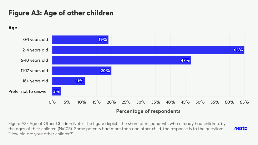 A horizontal bar chart titled 'Figure A3: Age of other children'. The vertical axis lists 'Age' categories, and the horizontal axis measures the 'Percentage of respondents' from 0% to 65%. The blue bars show the following distribution from top to bottom: 0-1 years old at 19%; 2-4 years old at 65%; 5-10 years old at 47%; 11-17 years old at 20%; 18+ years old at 11%; and Prefer not to answer at 3%. A footnote at the bottom reads 'Figure A3- Age of Other Children Note: The figure depicts the share of respondents who already had children, by the ages of their children (N=105). Some parents had more than one other child, the response is to the question: "How old are your other children?"'.