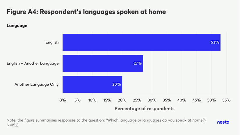 A horizontal bar chart titled 'Figure A4: Respondents' languages spoken at home'. The vertical axis lists 'Language' categories, and the horizontal axis measures the 'Percentage of respondents' from 0% to 55%. The blue bars show the following distribution from top to bottom: English at 53%; English + Another Language at 27%; and Another Language Only at 20%. A footnote at the bottom reads 'Note: the figure summarises responses to the question: "Which language or languages do you speak at home?"( N=152)'.