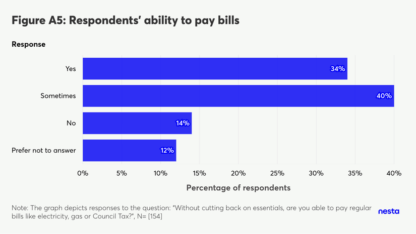 A horizontal bar chart titled 'Figure A5: Respondents' ability to pay bills'. The vertical axis lists 'Response' categories, and the horizontal axis measures the 'Percentage of respondents' from 0% to 40%. The blue bars show the following distribution from top to bottom: Yes at 34%; Sometimes at 40%; No at 14%; and Prefer not to answer at 12%. A footnote at the bottom reads 'Note: The graph depicts responses to the question: "Without cutting back on essentials, are you able to pay regular bills like electricity, gas or Council Tax?", N= [154]'.