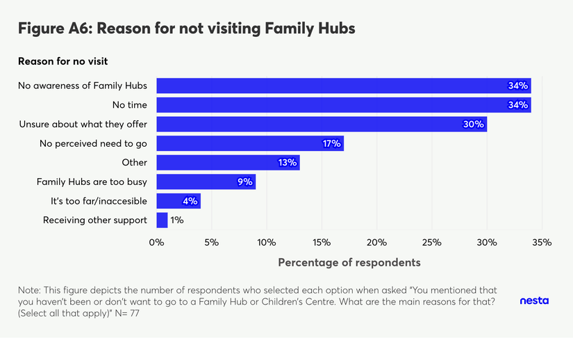 A horizontal bar chart titled 'Figure A6: Reason for not visiting Family Hubs'. The vertical axis lists 'Reason for no visit' categories, and the horizontal axis measures the 'Percentage of respondents' from 0% to 35%. The blue bars show the following distribution from top to bottom: No awareness of Family Hubs at 34%; No time at 34%; Unsure about what they offer at 30%; No perceived need to go at 17%; Other at 13%; Family Hubs are too busy at 9%; It's too far/inaccesible at 4%; and Receiving other support at 1%. A footnote at the bottom reads 'Note: This figure depicts the number of respondents who selected each option when asked "You mentioned that you haven't been or don't want to go to a Family Hub or Children's Centre. What are the main reasons for that? (Select all that apply)" N= 77'.