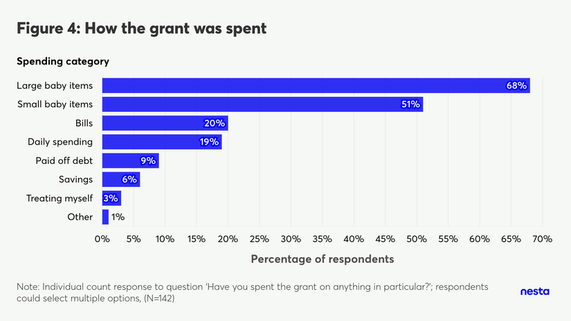 So far, the £500 grant is being used as expected: on items for the baby, or to cover costs that would otherwise represent a source of stress for parents (day-to-day spending, bills, debt). Our survey suggests that parents in the target group had faced high baseline levels of financial stress throughout their pregnancy. While the grant is not enough to remove financial stress, it provides a temporary buffer. Parents we interviewed shared the relief they felt from having received the grant, and how the money contributed to a sense of dignity and independence.