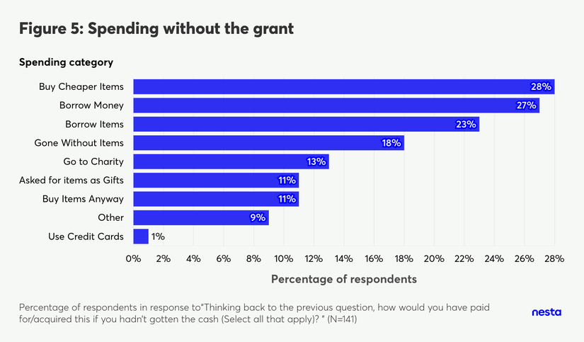 Money is fungible. Especially for recipients who spent the grant on baby essentials, it is likely they would have acquired those items even without the grant. To understand the impact of the grant, we asked survey respondents how they would have paid for or acquired the items they spent the grant on had they not received the grant. Respondents gave a wide range of answers, from purchasing cheaper options to borrowing money (formally or informally), borrowing the items, or receiving the items from charity or as a gift.