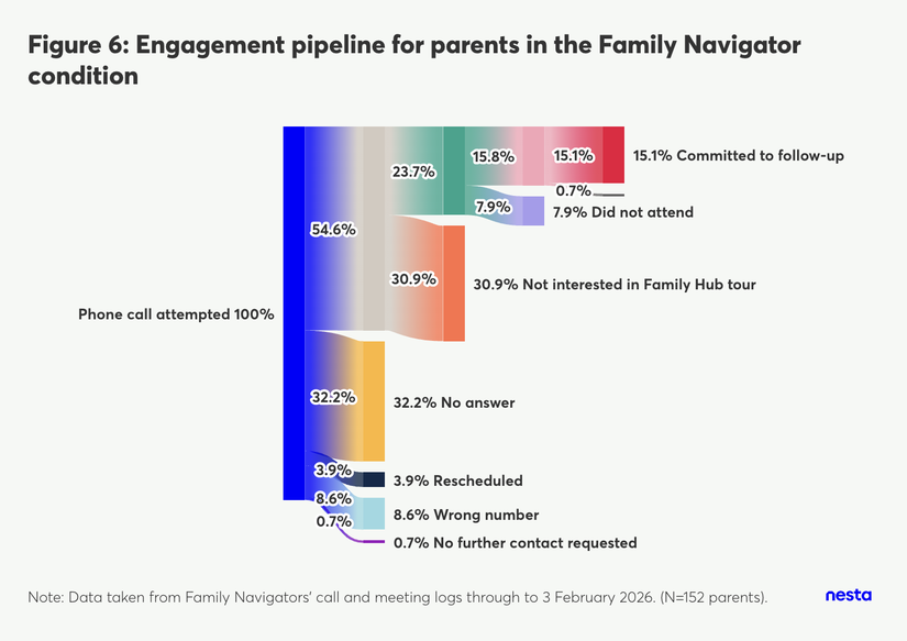 A Sankey diagram titled 'Figure 6: Engagement pipeline for parents in the Family Navigator condition'. It illustrates the flow of engagement starting from a single vertical blue bar on the left labeled 'Phone call attempted 100%'. This 100% splits into five paths: 54.6% continue down the pipeline, 32.2% result in 'No answer', 8.6% result in 'Wrong number', 3.9% are 'Rescheduled', and 0.7% request 'No further contact requested'. The 54.6% group then splits, with 23.7% continuing on and 30.9% being 'Not interested in Family Hub tour'. The 23.7% group splits again, with 15.8% continuing and 7.9% marked as 'Did not attend'. Finally, the remaining 15.8% splits into 15.1% who 'Committed to follow-up' and an unlabeled 0.7% drop-off. A footnote at the bottom reads 'Note: Data taken from Family Navigators' call and meeting logs through to 3 February 2026. (N=152 parents)'.