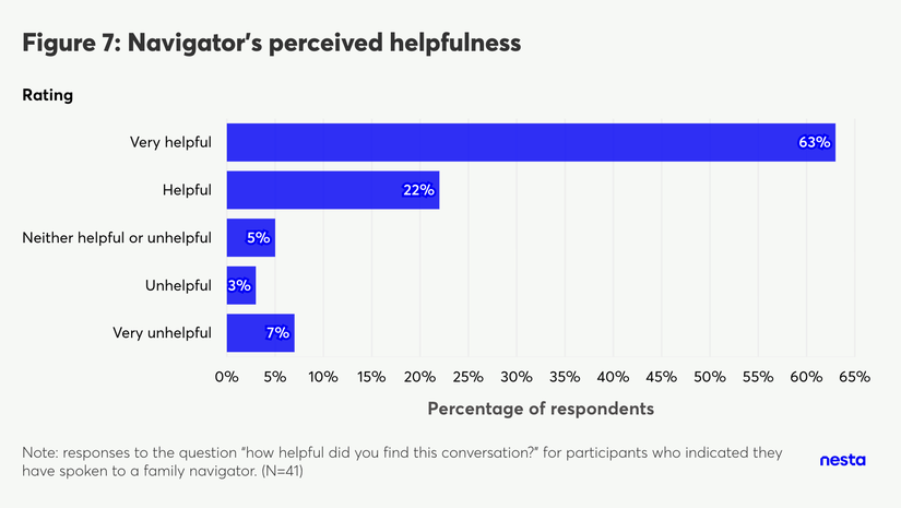 A horizontal bar chart titled 'Figure 7: Navigator's perceived helpfulness'. The vertical axis lists 'Rating' categories, and the horizontal axis measures the 'Percentage of respondents' from 0% to 65%. The blue bars show the following distribution from top to bottom: Very helpful at 63%; Helpful at 22%; Neither helpful or unhelpful at 5%; Unhelpful at 3%; and Very unhelpful at 7%. A footnote at the bottom reads 'Note: responses to the question "how helpful did you find this conversation?" for participants who indicated they have spoken to a family navigator. (N=41)'.
