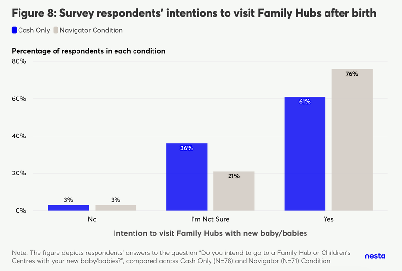 More broadly, when we asked survey respondents if they intend to visit Family Hubs once their baby/babies were born, those in the Navigator condition were more likely to say ‘yes’ instead of ‘unsure’ compared with those who only received the grant.