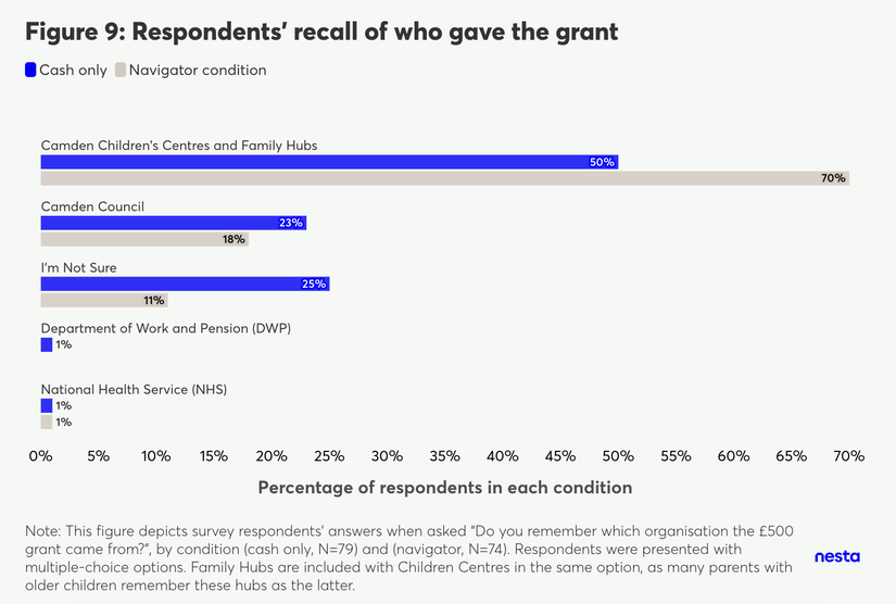 This association was more salient for survey respondents in the Navigator group. 70% of respondents in the Navigator condition correctly remembered that the grant came from Camden Family Hubs compared with 50% those who only received the grant but with no outreach from a Family Navigator.